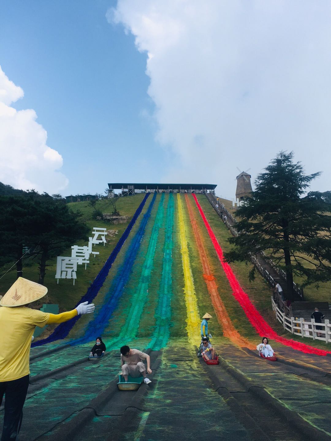 23日,我们行程的第二天,今天的所有环节都是勇者的项目。当缆车把我们送到云上草原时,山上清风阵阵,带着这份舒爽开启新一天的行程。下了缆车大家分小组出发,奔着自己要挑战的项目就去了。我们小分队采取保守理念,先柔和再刺激,强度慢慢增加有利于提高挑战成功的几率。在我们小分队爬过一个小山坡,又遇到几只大绵羊之后,来到滑草项目,排队时的忐忑被下滑时破风的感觉清光。第一站,所有人打卡成功。