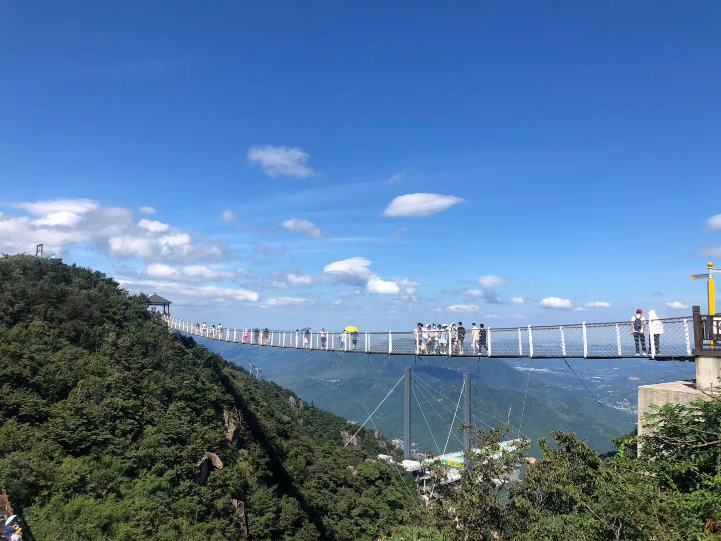 下一站就是“空中天阶”了,全透明“A”形悬挑空中玻璃桥,位于云上草原雪岭峰海拔1096米处,临崖90°而建,全长365米,整体由山体向外挑出达80.9米,是一个惊险唯美的“云端漫步”。大概是前面项目的挑战成功,这个项目大家表现得相当轻松,各种拍照合影。站在天阶的最前端,悬于千米有余的高空,远眺山河如画,低头云雾缭绕,赞叹大自然的壮美无比,也感叹人类的巧夺天工。大自然和人类智慧的结合才能造就如此美景和如此特别的体验。