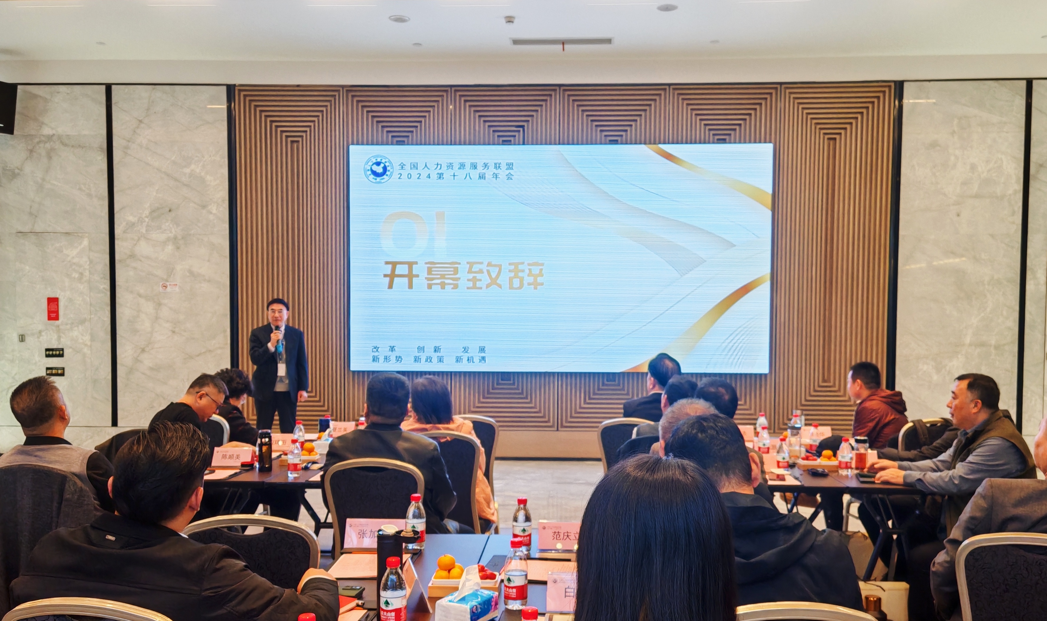 上海才俊人力资源(集团)有限公司董事长、全国人力资源服务联盟主席胡明胜先生出席会议开幕式并致辞。胡主席指出自全国人力资源服务联盟成立以来,一直致力于推动人力资源行业内的互助合作与信息共享,各成员单位均已成为行业的积极建设者。胡主席诚挚期待各成员单位能够深入探讨并共同研究人力资源行业在面对新形势、新政策以及新机遇时的应对策略和机制,优化生产结构,创新服务方式,以期实现行业的持续健康发展。