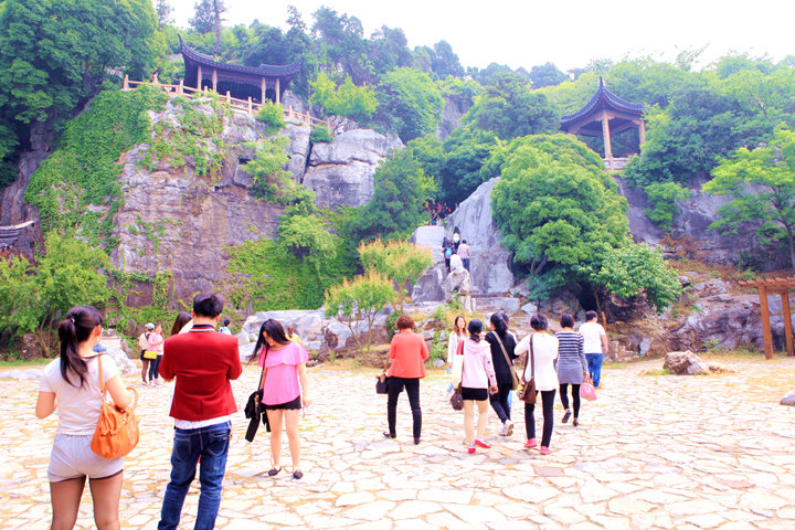 今天的天公还挺作美,多云的天空遮住了晒人的太阳,微微的习习凉风让人心旷神怡。第一站是小有名气的石公山,正所谓“山不在高,有仙则名”,仅有几十米高的石公山却有颇为传奇的历史。它三面临水,岩石奇秀,翠柏葱郁。石公山以前有奇石两块,伛偻似老翁的就是石公,另一块是石婆。他俩差肩而立,相对而望,传说在日夜思念着隔湖的大姑、小姑。石公山之名由此而得。小小的山头有橘香亭、御墨亭、断山亭、来鹤亭、归云洞、夕光洞、一线天、明月坡、云梯等人文景点与湖光山色相应成辉,令人流连忘返。员工们时不时拿出相机或手机在景点前留下纪念的映像。