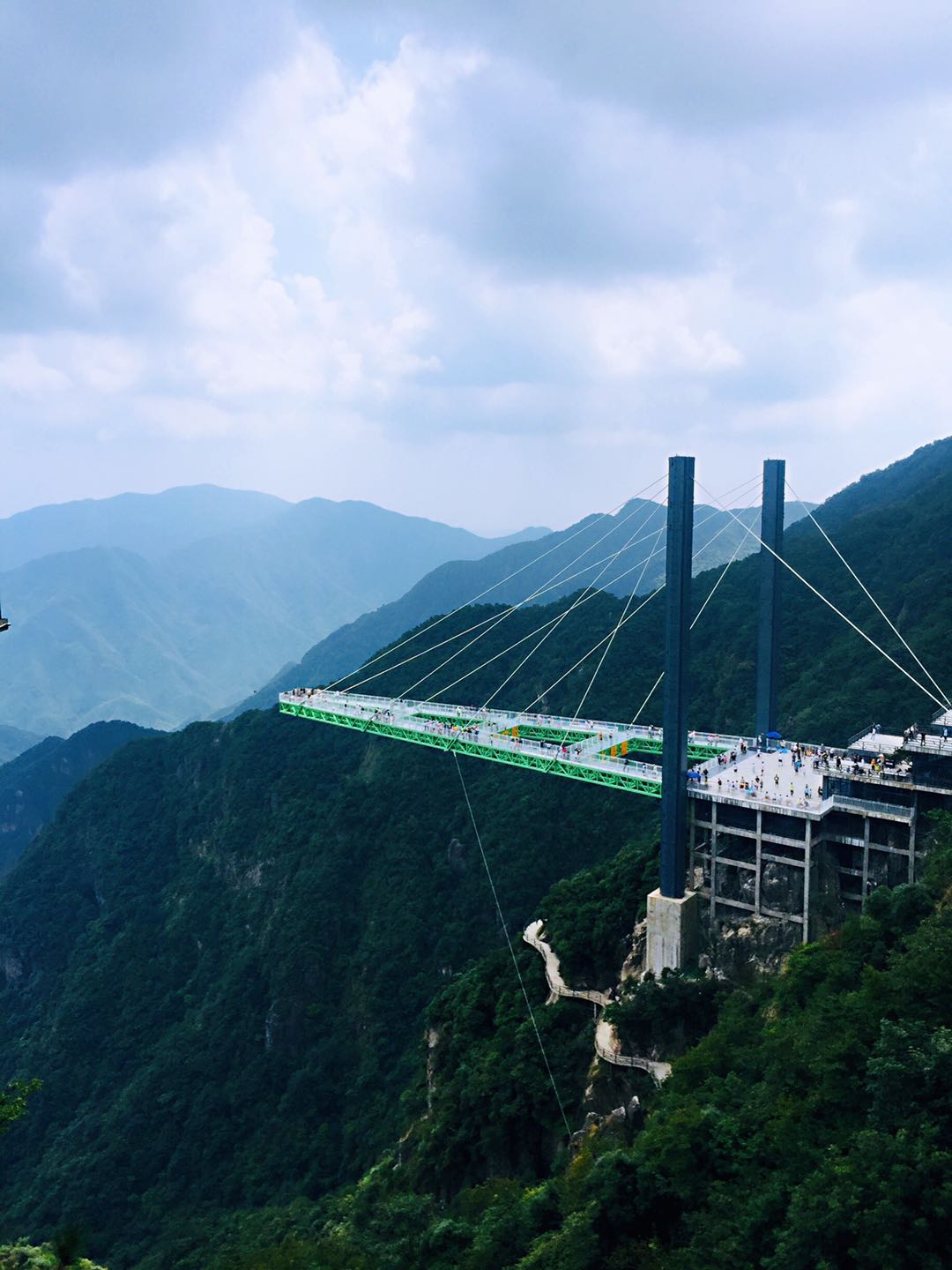 下一站就是“空中天阶”了,全透明“A”形悬挑空中玻璃桥,位于云上草原雪岭峰海拔1096米处,临崖90°而建,全长365米,整体由山体向外挑出达80.9米,是一个惊险唯美的“云端漫步”。大概是前面项目的挑战成功,这个项目大家表现得相当轻松,各种拍照合影。站在天阶的最前端,悬于千米有余的高空,远眺山河如画,低头云雾缭绕,赞叹大自然的壮美无比,也感叹人类的巧夺天工。大自然和人类智慧的结合才能造就如此美景和如此特别的体验。