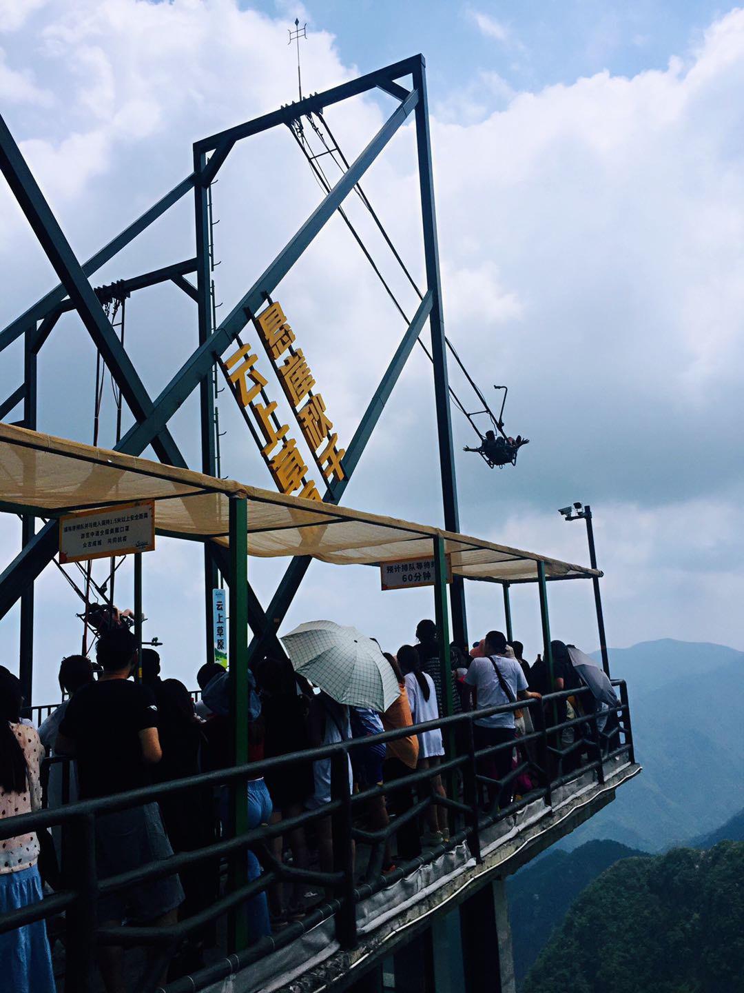 第一个项目的挑战成功,大大增加了我们的自信心,之后玩了卡丁车、彩虹滑滑梯和射击,然后带着不断挑战自我的信心朝着“云海栈桥”出发了。云海栈桥是一座横跨在一个山谷上方的栈桥,风吹过山谷,栈桥在山谷上方小幅度的摇摆,可这个小幅度的摇摆,在恐高者的眼里已经是天旋地转了,最终队伍里最恐高的小Z,抓着小C的胳膊闭眼走过了这座云海栈桥,也许没看到美景,但是迈开了战胜恐惧的第一步,就是胜利。